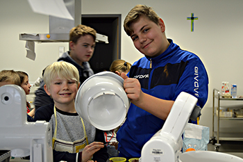 Die Zubereitung der Speisen erfolgte zunächst als Übung. Hierbei teilten sich die Schüler die anfallenden Aufgaben in ihren Teams auf und probten die Arbeitsabläufe der Zubereitung ein. Eine Woche später war es dann endlich soweit. Unter Anleitung der Sechstklässler wurde gemeinsam das Drachenfrühstück zubereitet. Hier konnten diese nicht nur ihr neu erworbenes Wissen weiter geben, sondern auch den Umgang mit Jüngeren einüben. Es wurde zerkleinert, gerührt, gebacken und viel gelacht. Die Schüler hatten sichtlichen Spaß am gemeinsamen Arbeiten. Vor dem Frühstück gab es noch eine eigens ausgewählte Drachengeschichte, die von einigen Sechstklässlern vorgetragen wurde.
